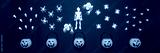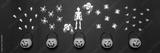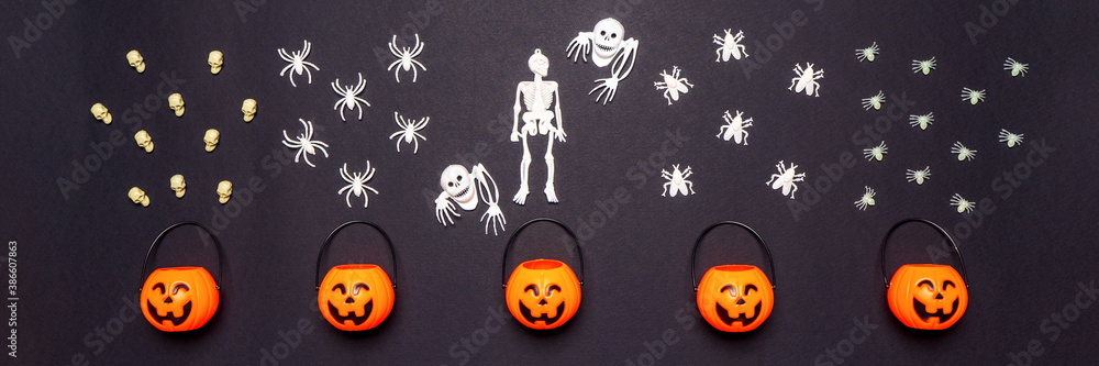 Halloween composition. Pumpkin baskets with skeletons, flies and spiders on black background. Happy halloween, trick or treat party concept. Flat lay, top view, banner