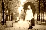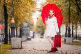 Satisfied girl with red umbrella and shopping packages goes on autumn city street