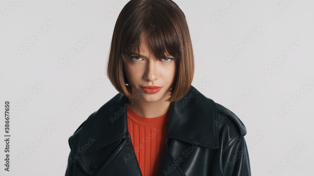 Serious girl with bob hair looking from under the forehead isolated on white background. Angry girl