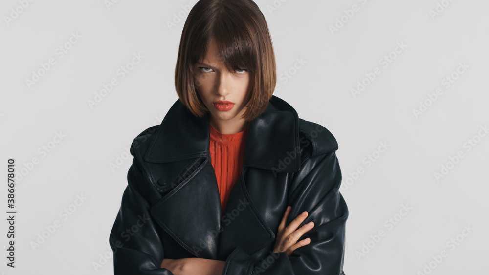 Aggressive girl with bob hair and red lips looking from under the forehead angry posing on camera isolated on white background