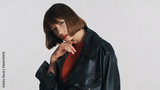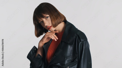 Beautiful model with bob hair confidently posing on camera over white background. Model working in studio