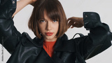 Beautiful brunette girl with bob hair and red lips confidently looking in camera over white background