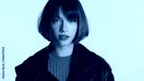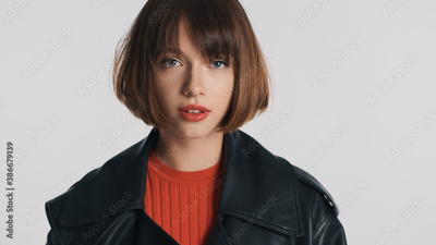Gorgeous model with bob hair and red lips looking disheveled on camera isolated on white background