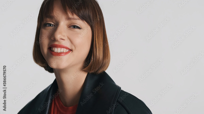 Portrait of cheerful girl with bob hair looking smiling on camera isolated over white background. Positive girl