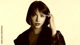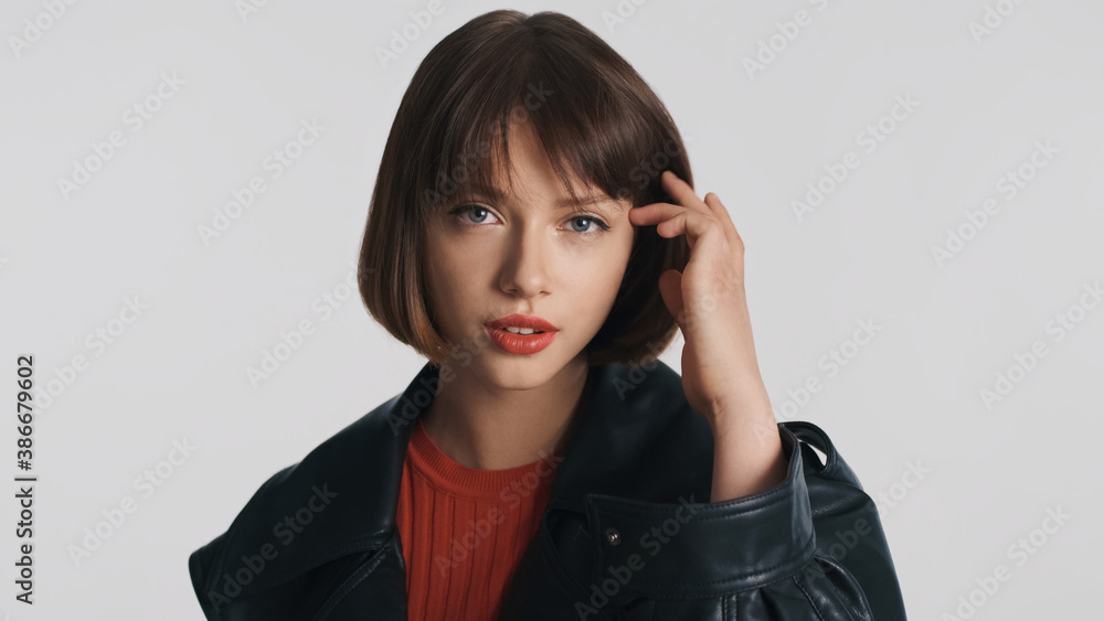 Pretty girl with bob hair and red lips looking pensive isolated on white background. Thoughtful girl looking in camera in studio