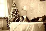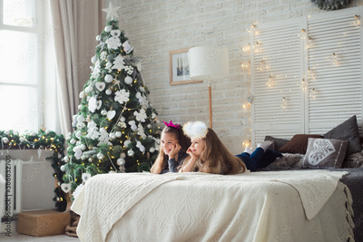 two funny girls lying on bed in new year decorated room