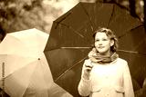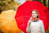 Portrait of a girl walking under bright red umbrella in the autumn city