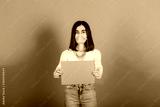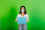 Serious girl wearing protective face mask holds empty blue paper sheet in hands, isolated on green background. Copy space.