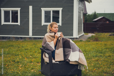 Woman sitting at backyard with cup of hot drinks and warm plaid