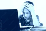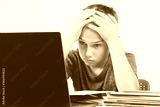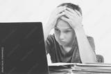 Kid with laptop computer doing homework at home. Technology, online learning, distance education