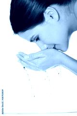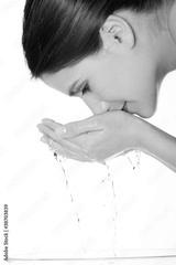 Young female washing her face with clear water