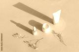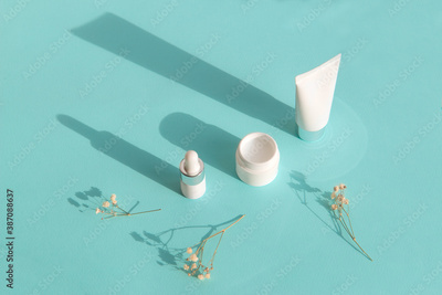 White cream tubes on blue paper background. Woman beauty cosmetic products for skin care. Hard light.
