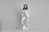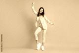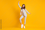 Full length body size photo of dancing girl wearing white checkered formal wear smiling isolated on bright yellow color background