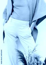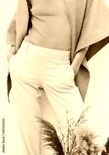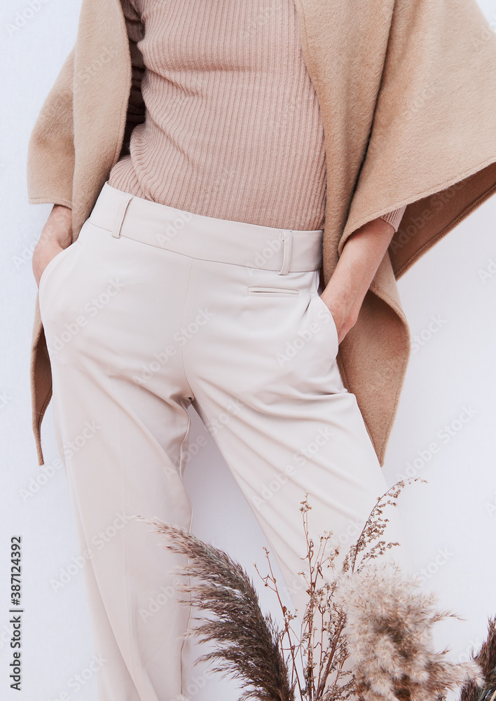 Stylish Pants and sweater. Details of everyday look. Model wearing casual beige outfit. Trendy minimalistic style. Beige aesthetics. Fashion look book. Warm Fall Winter seasons