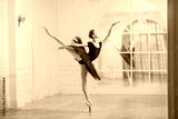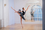 young ballerina in a black tutu is dancing on pointe in large bright hall in front of a mirror.