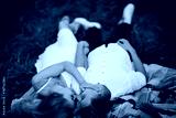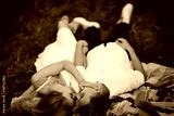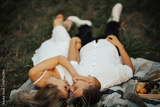Beautiful girl stroking guy face on romantic picnic in park while lying on green grass.