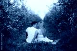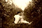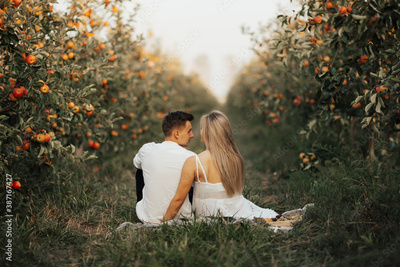 Beautiful couple dressed in elegant clothes sitting on green grass in apples orchard at summer picnic. Back view.