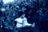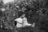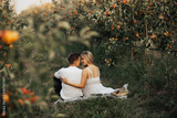 Young couple sitting back to camera on picnic blanket in the apples garden. Summer picnic.