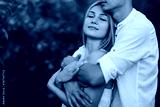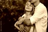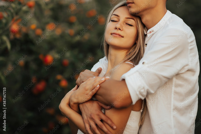Guy in a white shirt hugs from behind a beautiful girl in a white dress in the apples orchard. She closed eyes. Cropped shot.