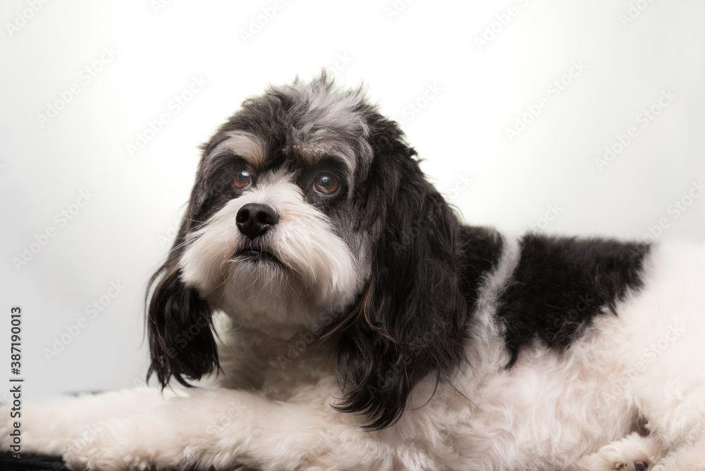 Cavapoo dog. Mixed breed Cavalier King Charles Spaniel cross poodle portrait, high key. Small black and white pup with long floppy ears and expressive eyes.