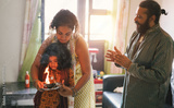 Indian family celebrating religion hindu event at home - Soft focus on man face