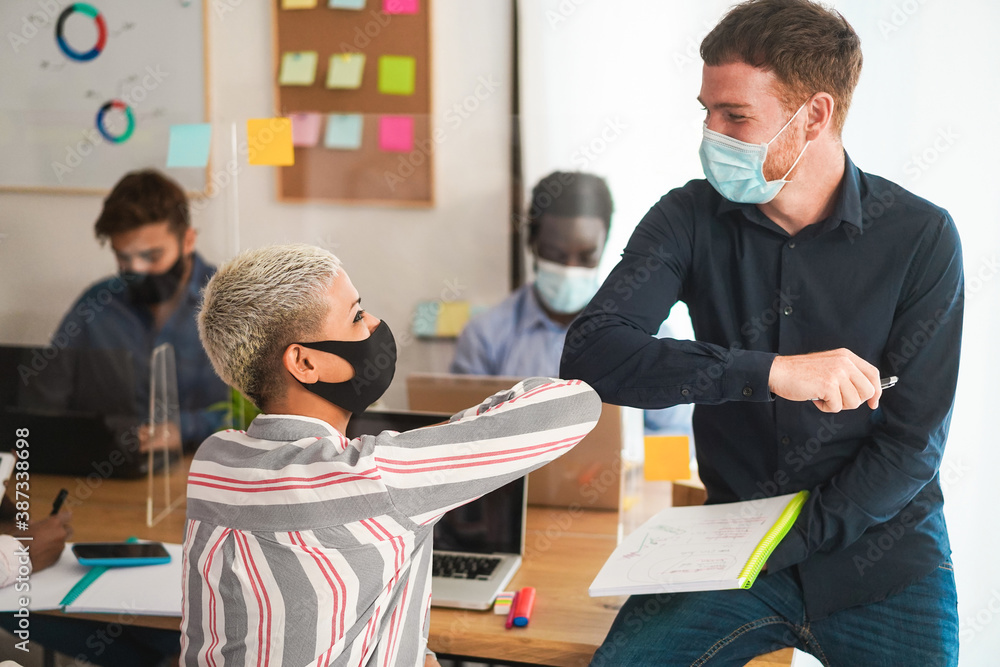 Young coworkers wearing face masks while bumping their elbows instead of greeting with a handshake - Focus on right girl eye - Startup, coworking and business concept during coronavirus outbreak