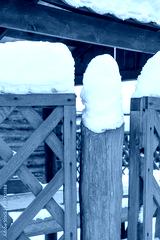 Wooden fence and roof covered with snow in winter cloudy day after snowfall. Winter season, cold weather concept. Beautiful winter background in rustic style, copy space