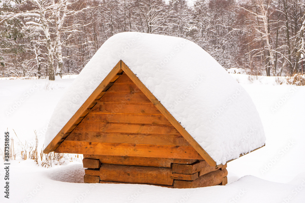 Picturesque winter landscape with snow covered roof of wellspring in cloudy day after snowfall. Season details, cold weather.