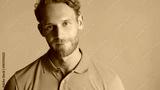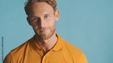 Attractive bearded man confidently posing on camera over colorful background. Face expression