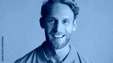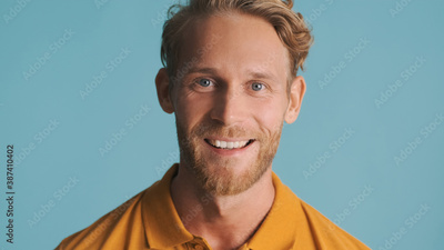 Portrait of young bearded smiling man looking excited isolated on blue background