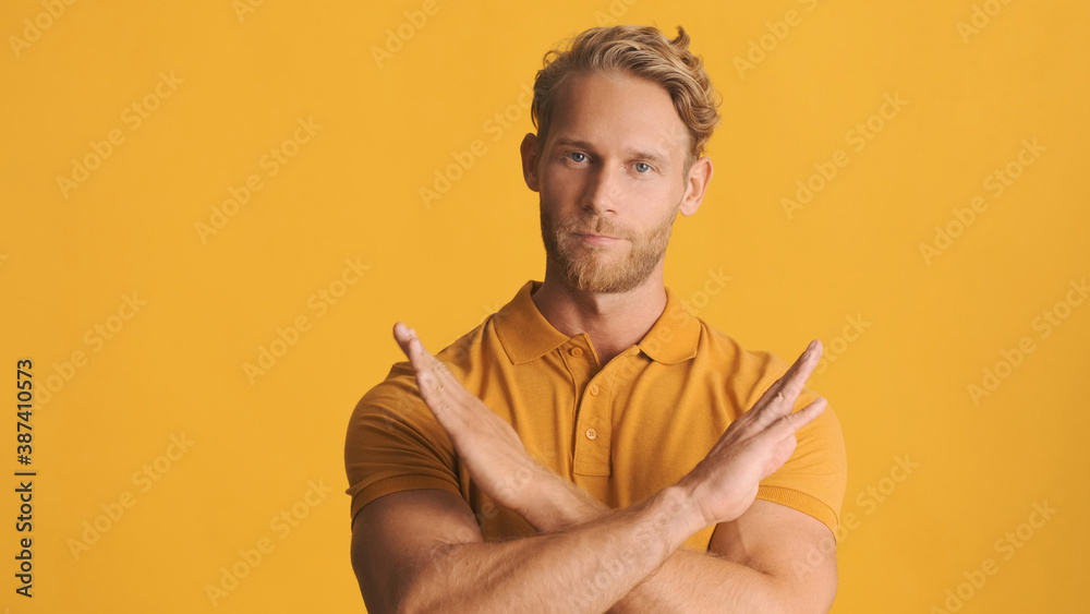 Handsome serious bearded man confidently showing crossed hands on camera over colorful background. No expression