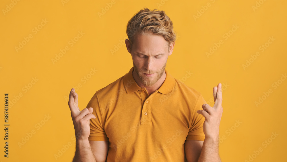 Attractive bearded man with crossed fingers hopefully praying on camera isolated on yellow background