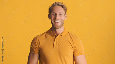 Young smiling bearded man dressed in casual wear looking happy on camera over colorful background