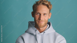 Attractive stylish bearded guy in hoodie intently looking in camera and smiling isolated on blue background