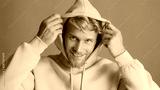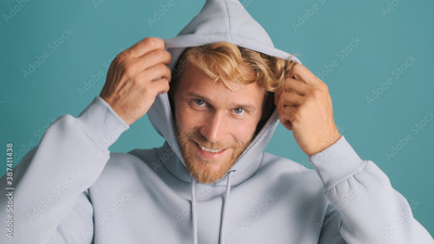 Handsome stylish bearded guy in hood looking happy over colorful background. Attractive casual male model posing in studio