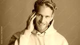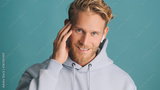 Attractive smiling bearded man in hoodie looking happy listening music in wireless earphones isolated on blue background