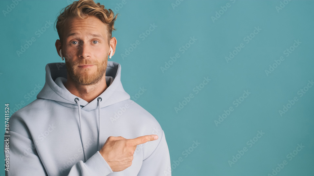 Handsome stylish bearded man in hoodie wear wireless earphones showing place for advertisement or promotional text over colorful background