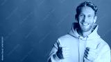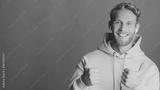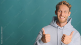 Positive stylish bearded man in hoodie wear wireless earphones keep thumbs up near place for advertisement or promotional text over colorful background. Well done expression