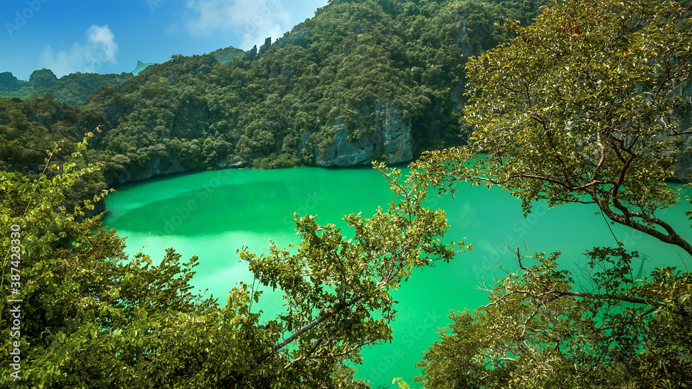 Angthong marine park near koh Samui, Thailand. Beautiful tropical island panoramic view with blue sky and water, exotic thai nature. Famous travel destination