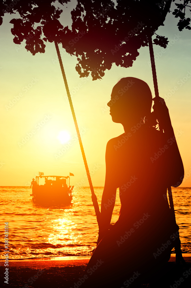 Silhouettes on the beach in the setting sun on Samet Island, Thailand