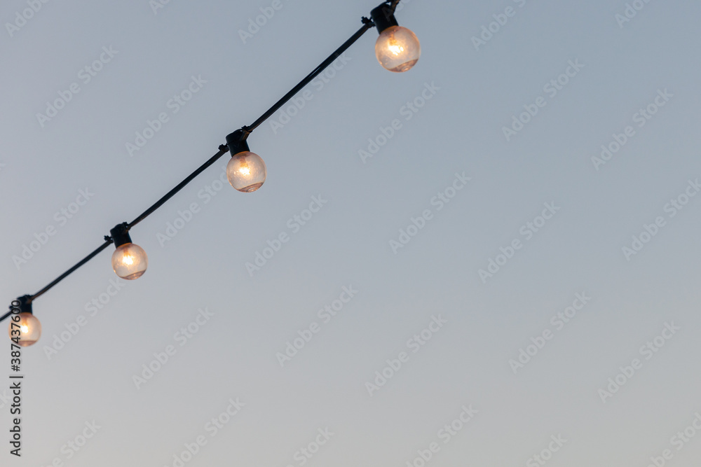 light bulbs garlands on a background of blue sky.
