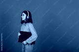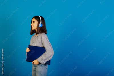 Positive smiling girl in stylish casual clothes and headphones holding laptop while standing isolated on blue background with copy space for advertisement.