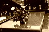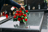 Old woman laying down bouquet of artificial flower on a grave