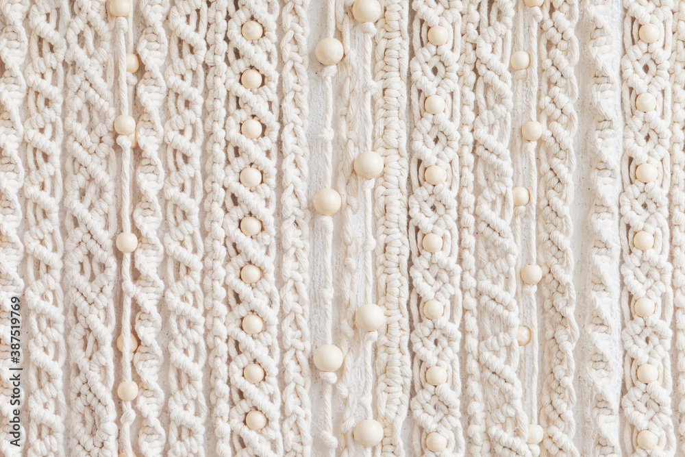 Close-up of hand made macrame texture pattern. Eco friendly modern knitting. Natural decoration concept in the interior. Handmade macrame wall hanging 100% cotton and wooden beads