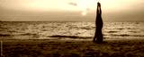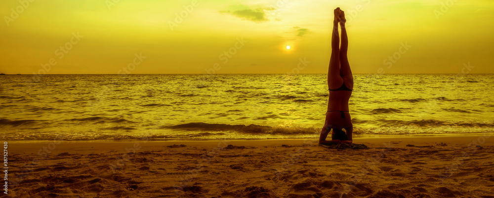 A young woman practices in yoga on the sea beach in asia during a beautiful sunset.