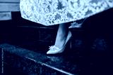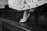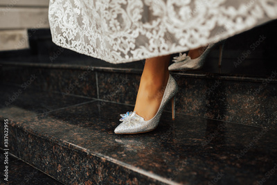 Close up of bride legs in elegant shoes is comes down on the stairs. Wedding details.
