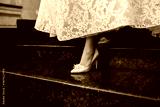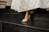 Bride in white dress and elegant shoes on marble stairs. Legs of the bride in white shoes.