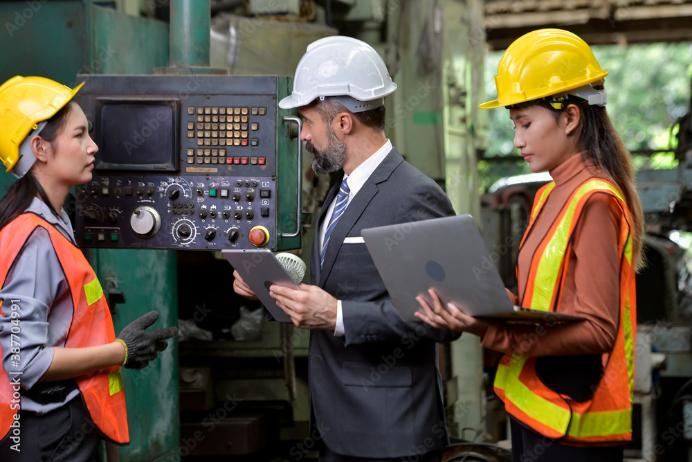 Two female engineer girls And management consultant for auto parts design at an auto parts factory in Thailand.