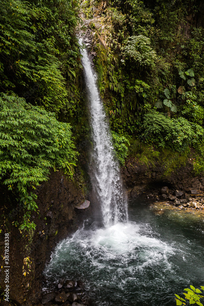 Lush tropical plants surround La Paz waterfall in Costa Rica