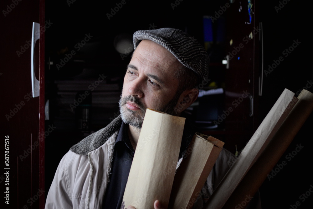 gentleman holding drawings and old maps